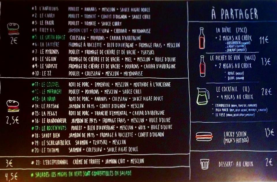 Côté cuisine Miga vous propose des petits sandwichs à partir de 2€ et des salades. Le choix des ingrédients proposés satisfera tout le monde. Les desserts sont aussi à tomber!!!! Et pour accompagner tout ça: de la bière ou de la citronnade faite maison.