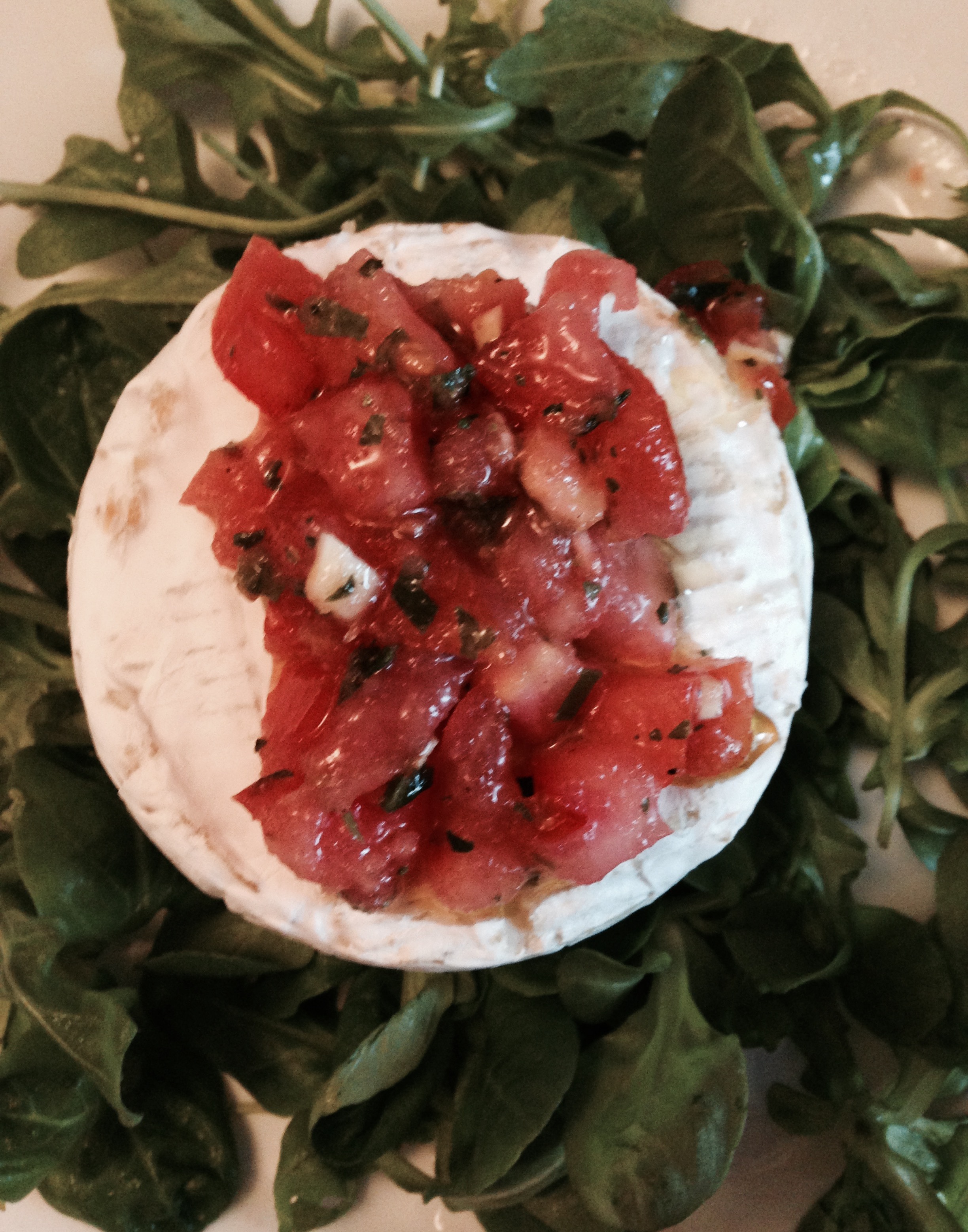 -Pendant que le camembert cuit préparer la sauce d’assaisonnement: couper les tomates en petits dés et l’ail et le basilic très finement. Mettre le tout dans un bol. Recouvrez ce mélange avec de l’huile d’olives. Mettre au frais en attendant la fin de la cuisson du camembert.